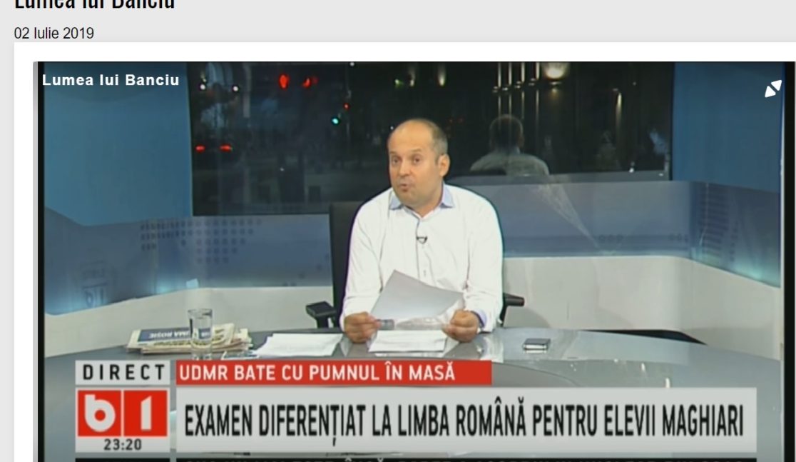 Az Országos Audiovizuális Tanács mai, csütörtöki ülésén, kizárólag a Mikó Imre Jogvédelmi Szolgálat panasza alapján, újabb 10.000 lejes bírságot szabott ki a B1 Televízióra, a Lumea lui Banciu július 2-i adása miatt. A műsorban, amely többek között a kisebbségi oktatásról szólt, Borboly Csaba, Hargita Megye Tanácsa elnökének kijelentése okozott felháborodást, miszerint a Hargita megyei magyar kisebbséghez tartozó diákoknak más kategóriájú román érettségi vizsga szerint kellene megmérettessenek.