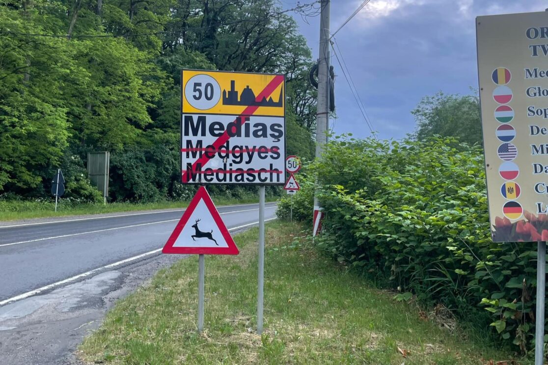 A kisváros háromnyelvű helységnévtábláján a magyar Medgyes és a német Mediasch neveket piros festékkel áthúzták. A közeli Kiskapuson a magyar feliratot, a Medgyes és Kiskapus közötti Nagyekemezőn a német feliratot húzták át piros festékkel ismeretlenek.
